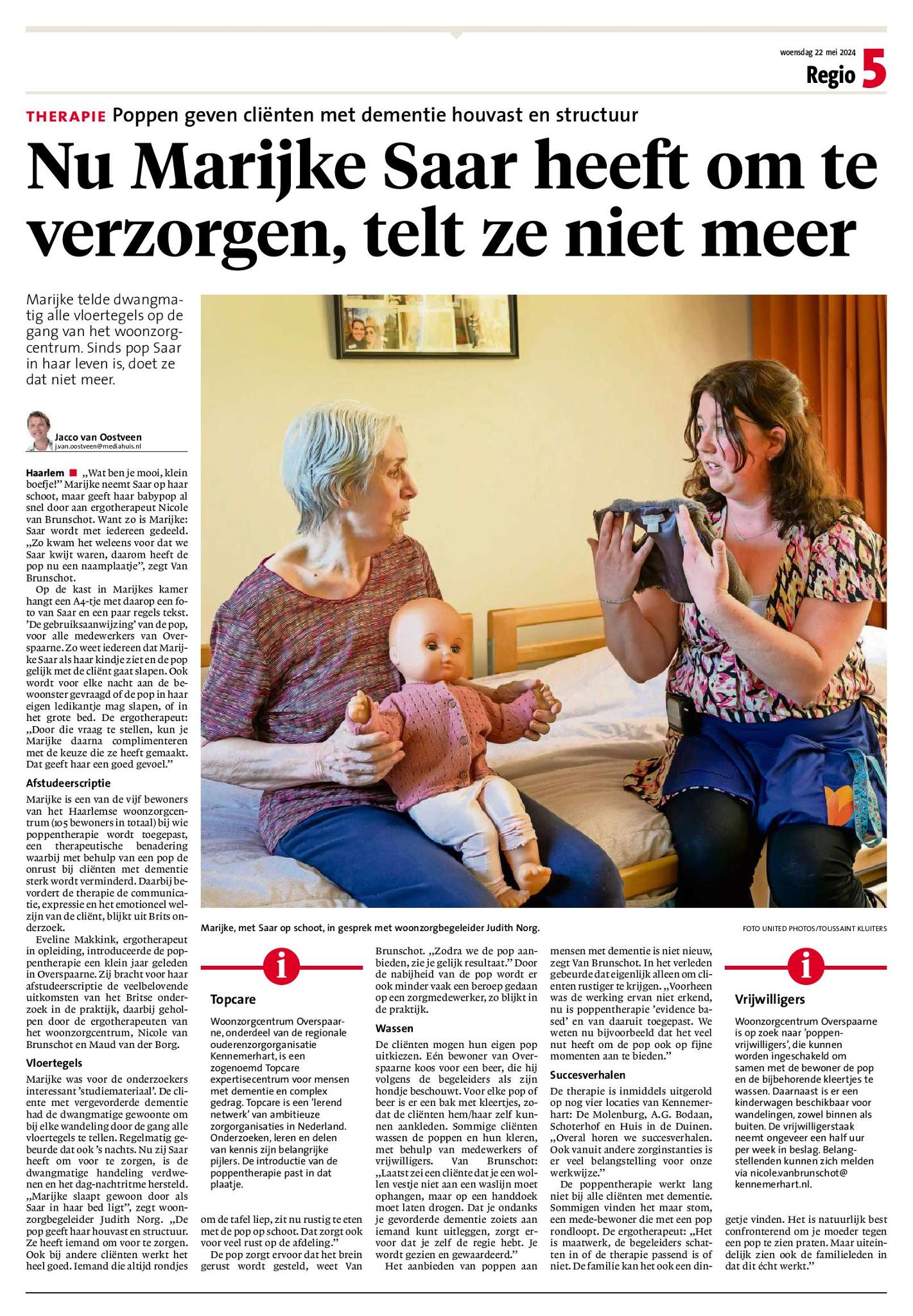 Vandaag staat een artikel in het Haarlems Dagblad over Poppentherapie in Overspaarne; een therapeutische benadering die gebruik maakt van poppen als hulpmiddel om communicatie, expressie en emotioneel welzijn van mensen met dementie te bevorderen.