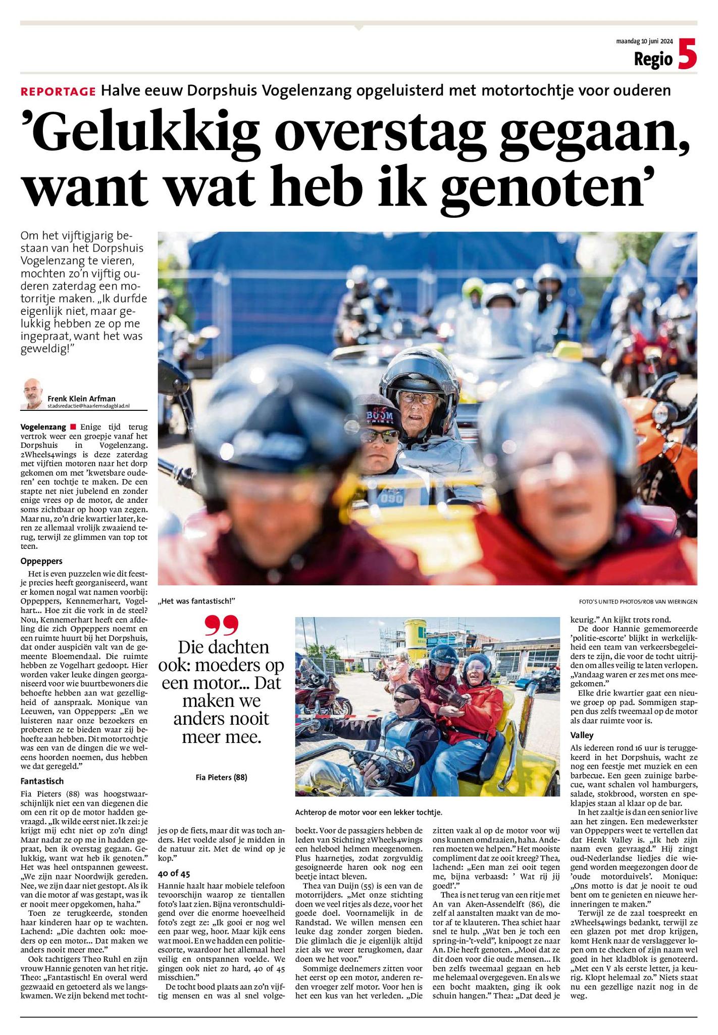 Het Haarlems Dagblad was erbij en sprak met Monique van Leeuwen van Kennemerhart Oppeppers. Ze vertelde over de wens van de Vogelhart bezoekers om eens een tochtje op de motor te maken. En hoe deze wens in vervulling ging door contact te zoeken met 2Wheels4Wings. deze organisatie organiseert al 20 jaar toertochten voor wie dit niet meer mogelijk is vanwege ouderdom of ziekte.