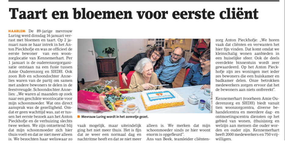 De 89-jarige mevrouw Luring werd verrast met bloemen en taart. Op 2 januari nam ze haar intrek in het Anton Pieckhofje en was ze officieel de eerste bewoner van deze woonzorglocatie van Kennemerhart.