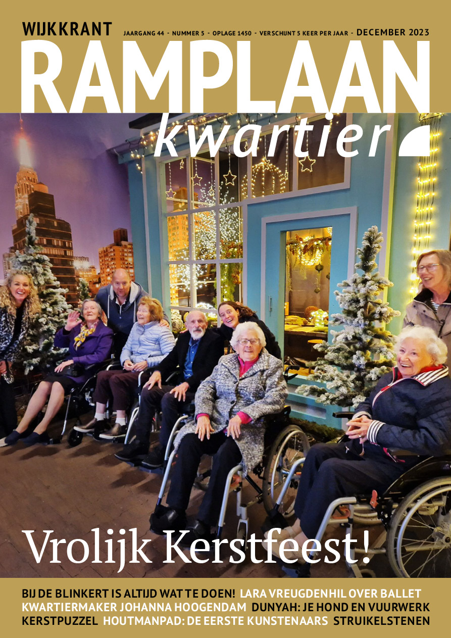 Bewoners en vrijwilligers van De Blinkert sieren de cover van de decembereditie van de wijkkrant Ramplaankwartier. De foto werd gemaakt tijdens een uitstapje naar 'winterwonderland' in tuincentrum Global Garden.