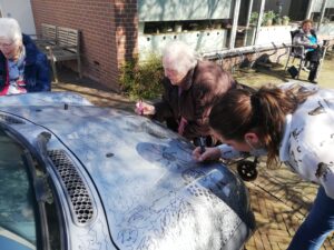 Zo vond de ene deelnemer het heerlijk om te doen en ging gelijk aan de slag. Een ander ging even kijken om zich daarna uit te leven met de stift en zei: “Dat mocht vroeger nooit, tekenen met een stift op de auto”. Een ander ging uitgebreid nadenken over een goed idee, een goede tekening. Weer een ander liet zich helemaal gaan. De een dacht dat het perfect moet zijn, een perfecte tekening van…gezicht, fiets of vrouw. De ander begon gewoon, de stift deed het werk, de lijnen en kronkels kwamen wel.