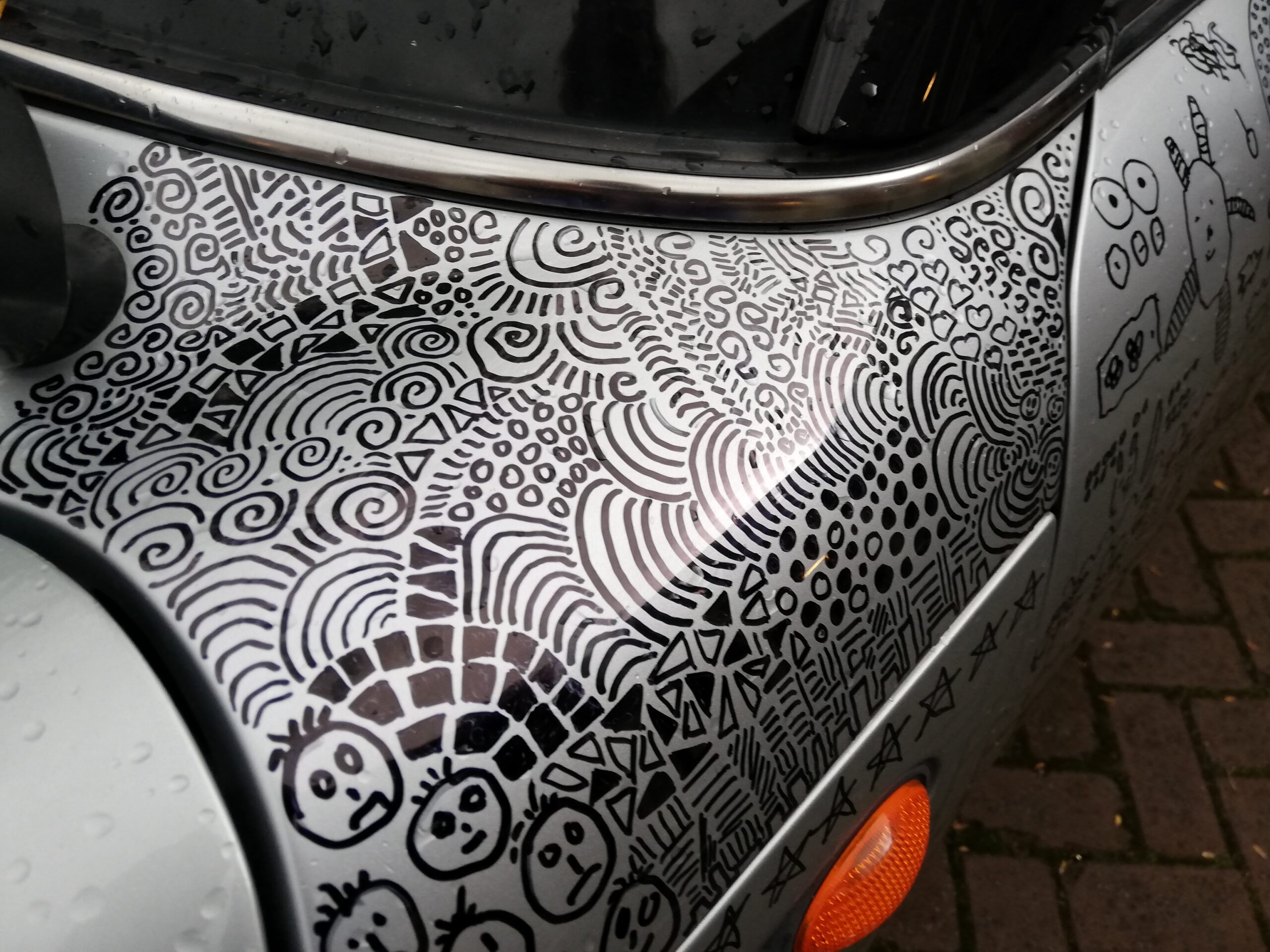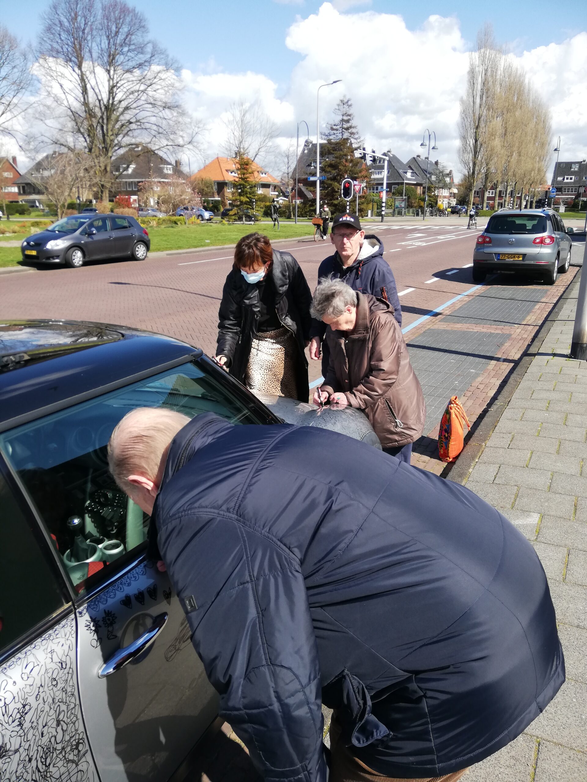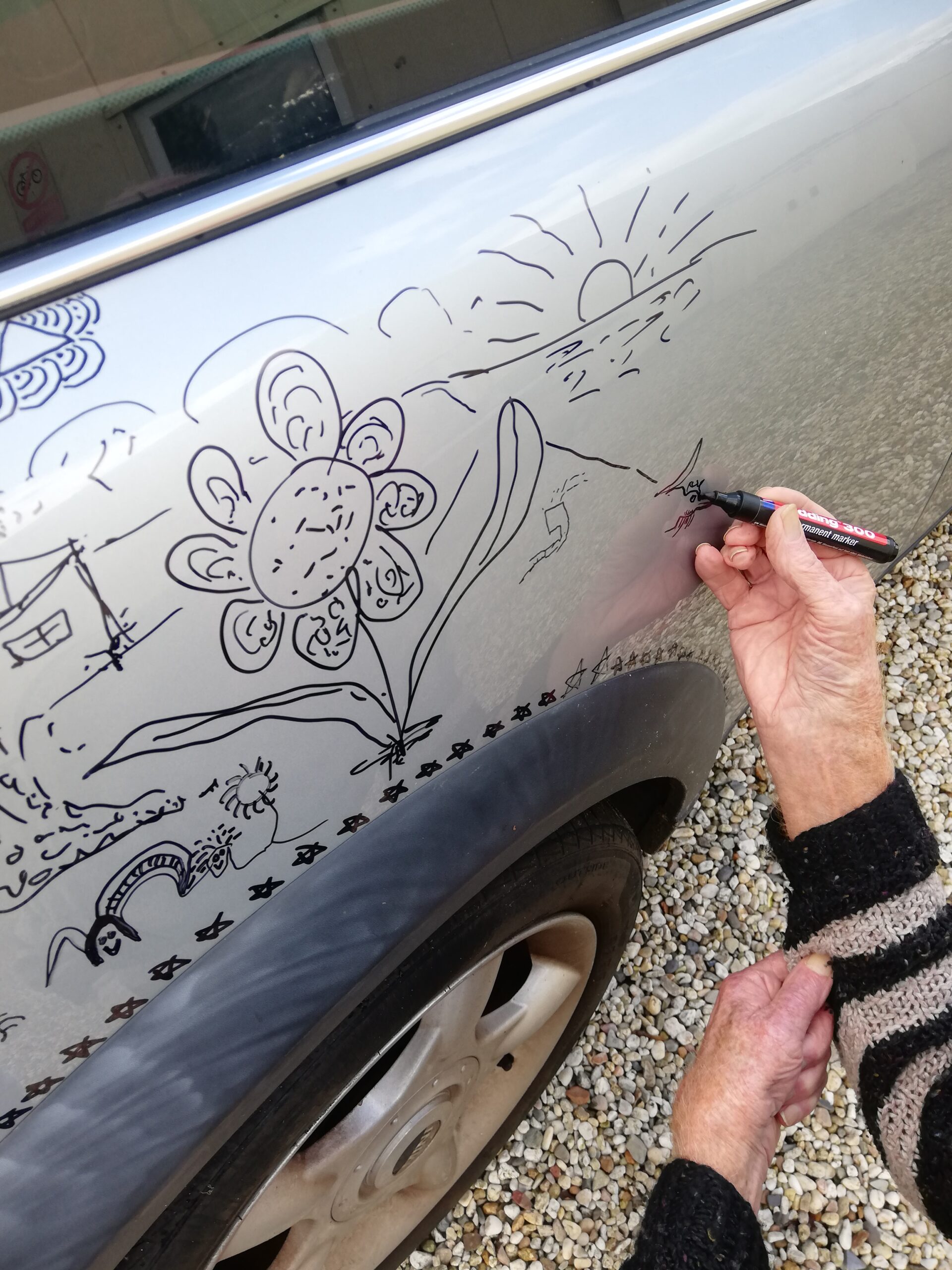 Zo vond de ene deelnemer het heerlijk om te doen en ging gelijk aan de slag. Een ander ging even kijken om zich daarna uit te leven met de stift en zei: “Dat mocht vroeger nooit, tekenen met een stift op de auto”. Een ander ging uitgebreid nadenken over een goed idee, een goede tekening. Weer een ander liet zich helemaal gaan. De een dacht dat het perfect moet zijn, een perfecte tekening van…gezicht, fiets of vrouw. De ander begon gewoon, de stift deed het werk, de lijnen en kronkels kwamen wel.