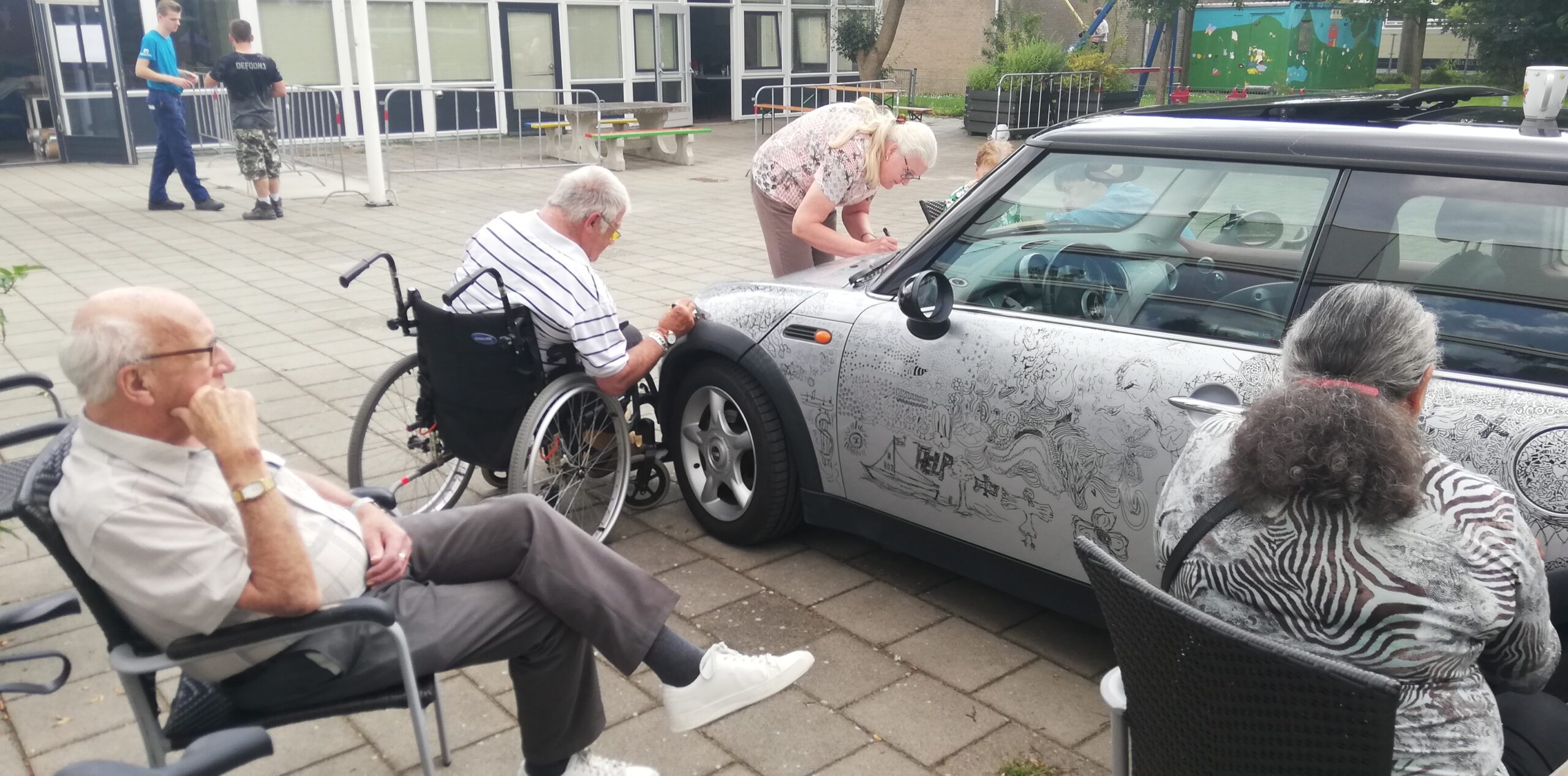 Anderhalf jaar geleden is Kennemerhart gestart met deze vernieuwende dagbesteding en is de naam Oppeppers gekozen. Immers als je een moment hebt meegedaan kom je echt wel ‘opgepept’ terug! Ook is er met het team van medewerkers gekeken naar eigentijdse en innovatieve activiteiten. Annemarie kwam toen met het idee om haar auto beschikbaar te stellen en daarop te droedelen. Daarbij is zij ook kunstenaar en wil zich graag verplaatsen in een bijzondere auto. Een mooie win-win situatie. Gedurende presentaties zoals de Fiets4daagse Haarlem, een participatiemarkt, vrijwilligersbijeenkomsten en nu het Car Art Festival vertegenwoordigd haar auto Kennemerhart Oppeppers.