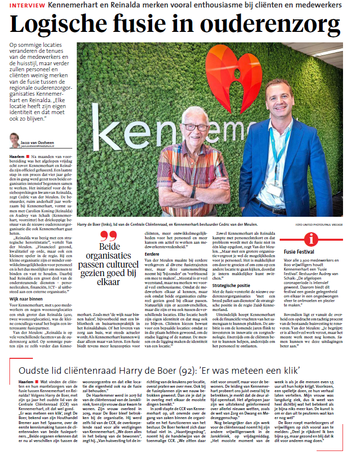 Op 1 juli 2022 was de fusie tussen Kennemerhart en Zorggroep Reinalda een feit. Het Haarlems Dagblad interviewde Cedric van der Meulen, bestuurder Kennemerhart en Harry de Boer, lid Centrale Cliëntenraad, over de fusie.