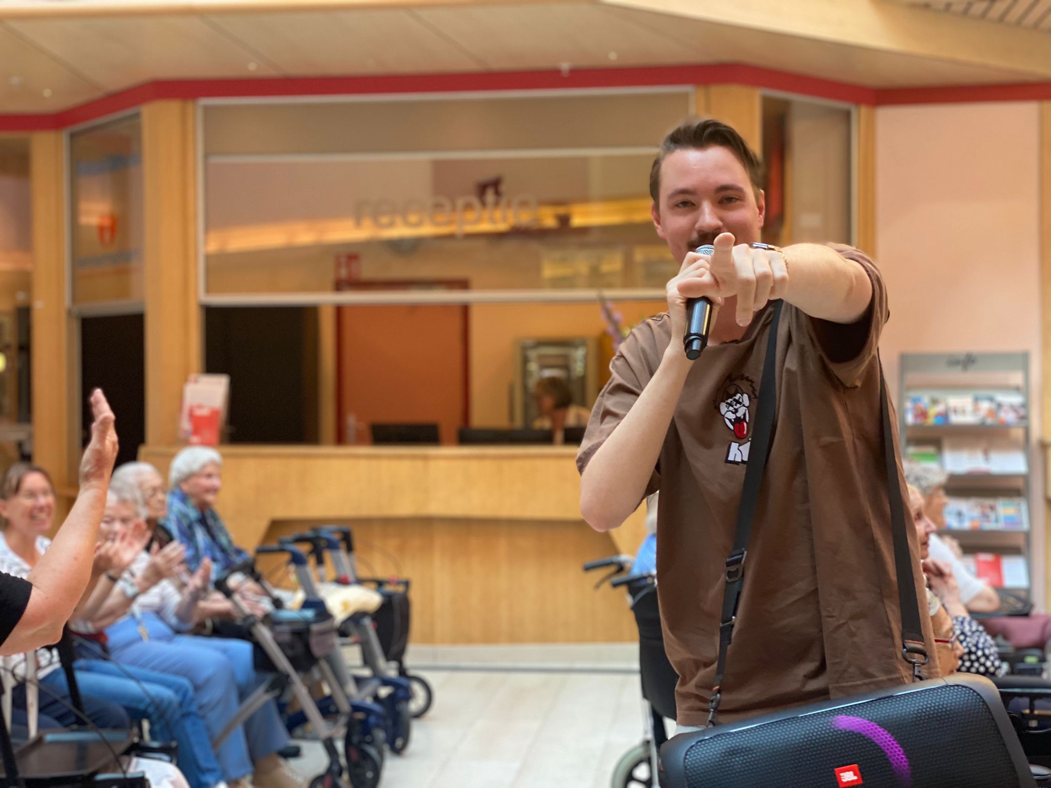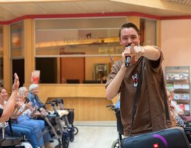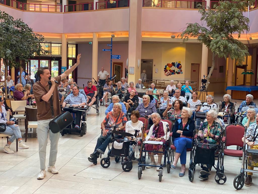 Vrijdag 15 september was Bram Krikke (DJ bij Qmusic) te gast in het Reinaldahuis van Kennemerhart. Hij gaf een optreden met liedjes uit 'de oude doos', zoals Una Paloma Blanca en Bij ons in de Jordaan en Pikketanussie. Maar ook een aantal nummers uit de 21e eeuw kwamen voorbij zoals Gangnam Style en Heb je even voor mij. Het atrium was tijdens zijn aanwezigheid goed gevuld met onze bewoners en vrijwilligers. Het welzijnsteam verwelkomde Bram met veel enthousiasme. Binnenkort delen we de video van zijn komst. Bedankt Bram namens het Reinaldahuis!