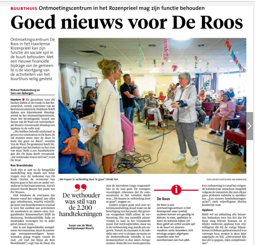 Op dinsdag 16 juli is er een bijeenkomst georganiseerd voor bewoners en omwonenden van De Roos om hen te informeren over de toekomst van De Roos. Deze bijeenkomst werd georganiseerd door Pré Wonen, Buurts, gemeente Haarlem en Kennemerhart.