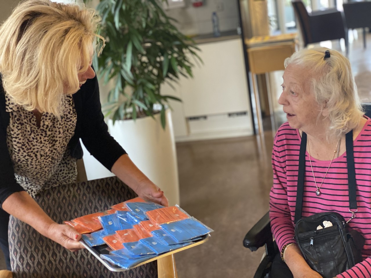 Meneer Dijkstra, mantelzorger van een cliënt van Kennemerhart, laat weten blij te zijn met het gebaar. “De afgelopen periode was ontzettend ingrijpend voor ons allemaal. Juist nú is het dan ook belangrijk dat we alert blijven en dat er snel weer betere tijden aanbreken. Deze gift is dan ook meer dan welkom.” Mevrouw Houweling een cliënt van Kennemerhart, laat weten; “Door het dragen van een mondkapje is de kans kleiner om je medemens te infecteren. Mag ik een oranje? Dat vind ik een mooie kleur.”