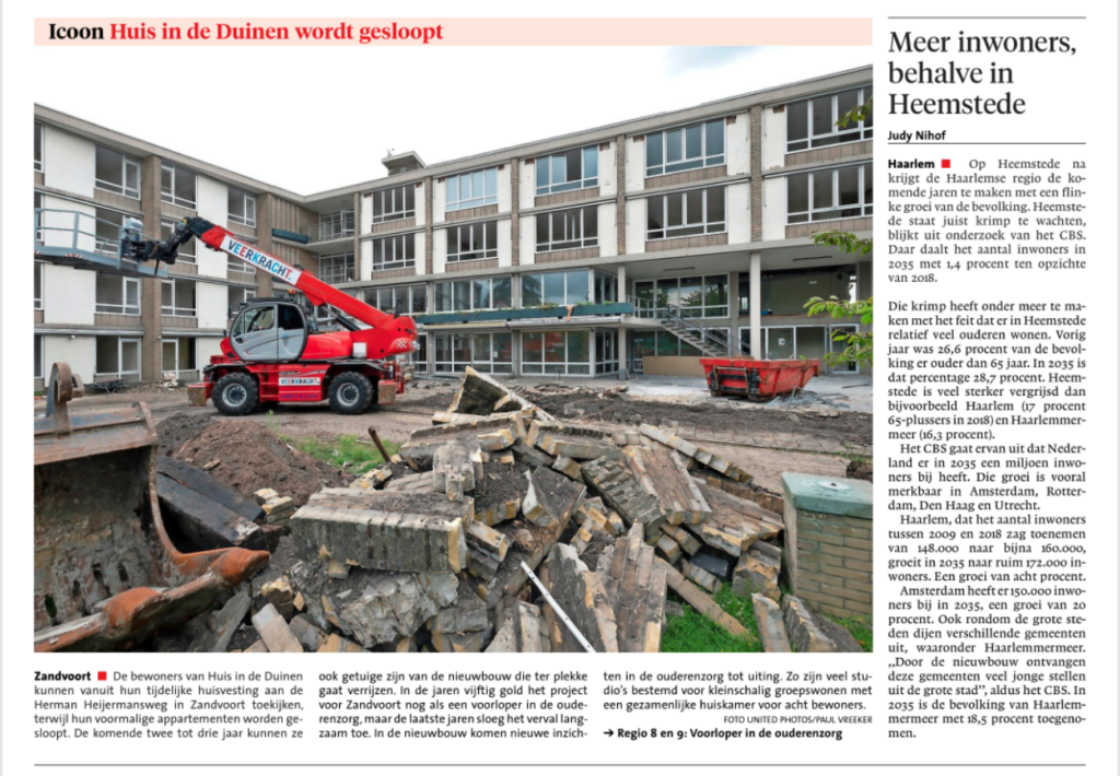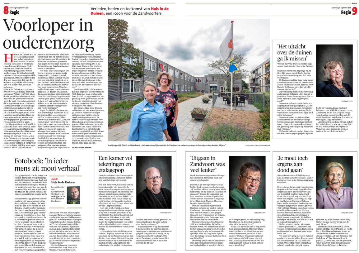 Huis in de Duinen, een icoon voor Zandvoorters en de Zandvoortse woonzorglocatie van Kennemerhart, was in de jaren vijftig voorloper in het naoorlogse denken over de ouderenzorg. Inmiddels is het huis, eigendom van Woonzorg Nederland, door de tijd achterhaald en komt er nieuwbouw op dezelfde unieke plek in de duinen vlakbij zee. De komende tijd woont een deel van de bewoners in de tijdelijke huisvesting. Afgelopen juni kwam het boek ‘Huis in de Duinen. Thuis in Zandvoort’ uit. Een boek waarin 44 portretfoto’s en interviews met bewoners centraal staan. Voor het Haarlems Dagblad aanleiding om een dubbele pagina over Huis in de Duinen en het boek te publiceren. De krant geeft een blik in het verleden, heden en de toekomst.