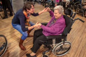 Jopie Tillemans-Weijers (85) beweegt heen en weer op het zitje van haar rollator, op de klanken van Foxy Foxtrot, haar ogen dicht. ,,Thuis waren ze nogal streng’’, mijmert ze. ,,Van mijn ouders mocht ik niets, behalve op zondagmiddag naar de dansschool. Dansles was alles voor me, daar werkte ik de hele week voor.’’