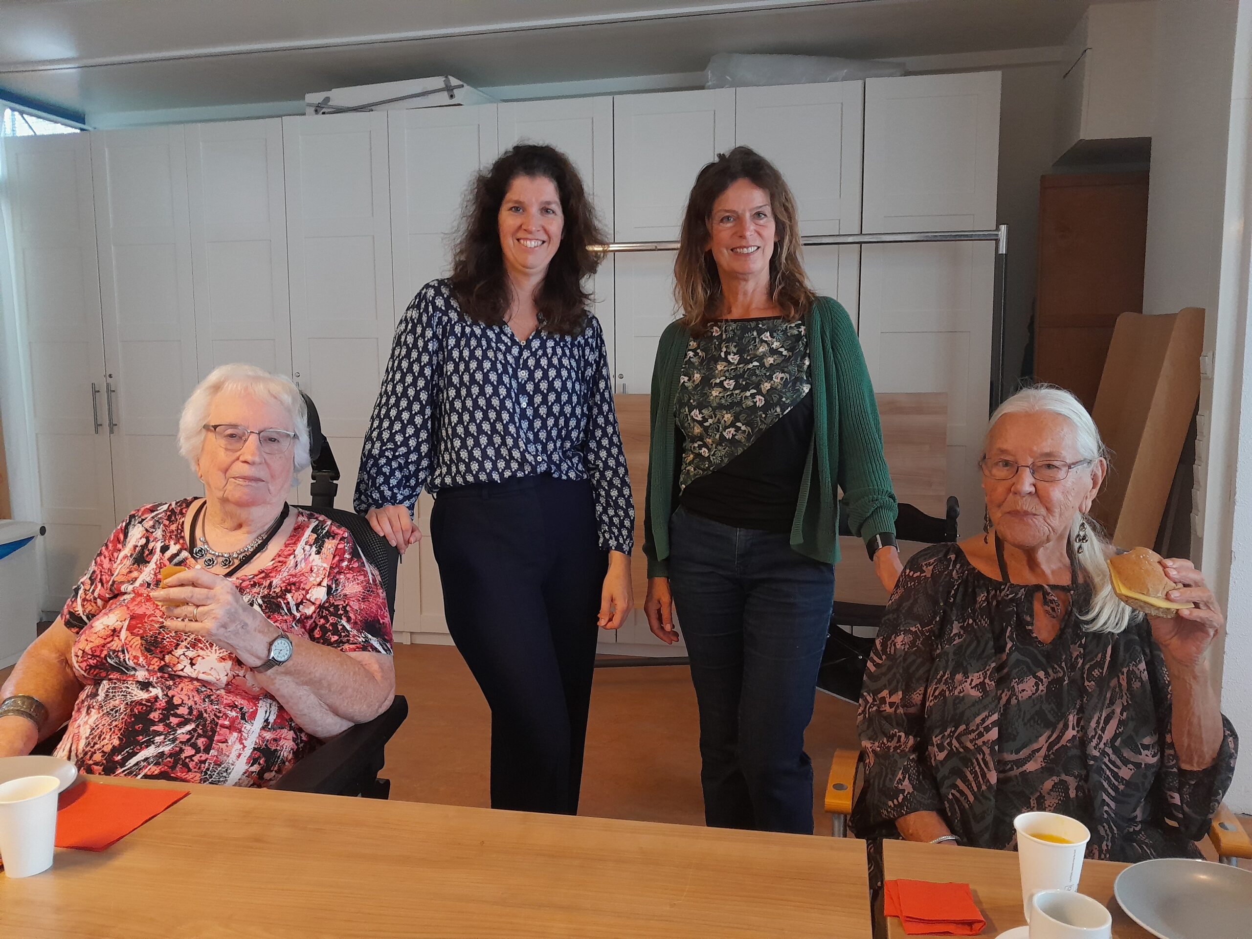 Twee bewoners van Schoterhof, samen met (links) wethouder van Loenen en Mirjam Rentema van Bibliotheek Haarlem.