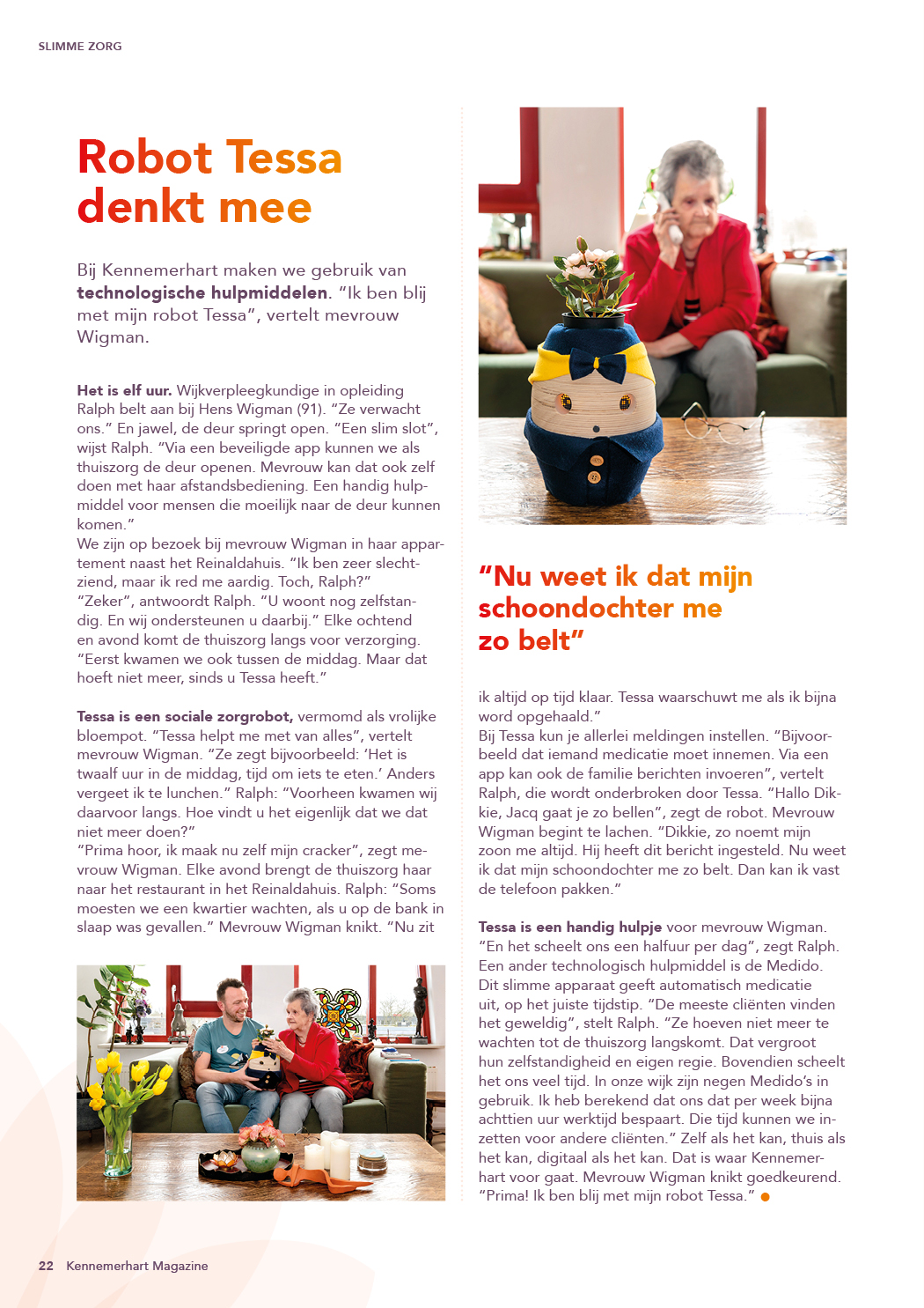 - De Tessa is een sociale zorgrobot vermomd als vrolijke bloempot die verbale begeleiding geeft. Ze is geduldig, vriendelijk en altijd beschikbaar. Ze geeft stapsgewijs instructies en herinnert je aan afspraken of dagtaken. Hierdoor kan een persoon weer meer zelf en is er minder zorg nodig. Lees hier het artikel uit het Kennemerhart magazine 2023/2024 over hoe wij de Tessa en de Medido inzetten.