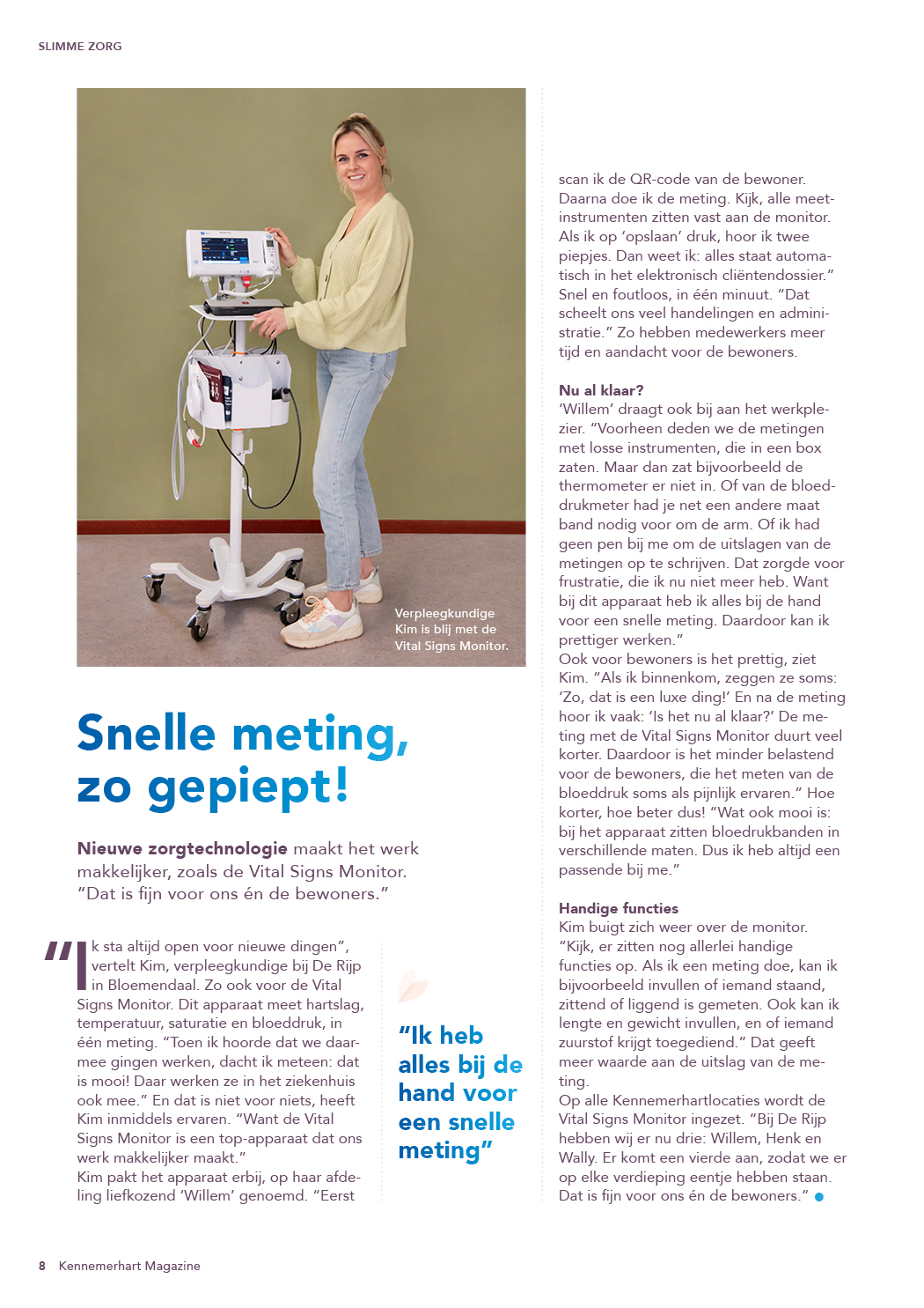 - De Vital Signs Monitor meet hartslag, temperatuur, saturatie en bloeddruk, in één meting en wordt op alle Kennemerhartlocaties ingezet. Dit proces duurt slechts één minuut, waardoor verpleegkundigen zich volledig kunnen richten op wat echt belangrijk is: het welzijn van de bewoners. Lees hier het artikel uit het Kennemerhart Magazine 2024/2025 over hoe verpleegkundige Kim de Vital Signs Monitor inzet.